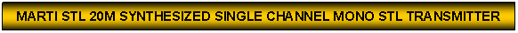The STL-20M is our latest mono STL transmitter. This transmitter replaces the STL-10. There are a number of changes that were made to make this the price-value leader in mono STL products. The STL-10M is synthesized, has a new RF amplifier, as well as a cooling fan. More power, reliable, cooler, and easier to tune – that’s the new STL-20M. Two of these units can be used to build a discrete stereo STL system. |